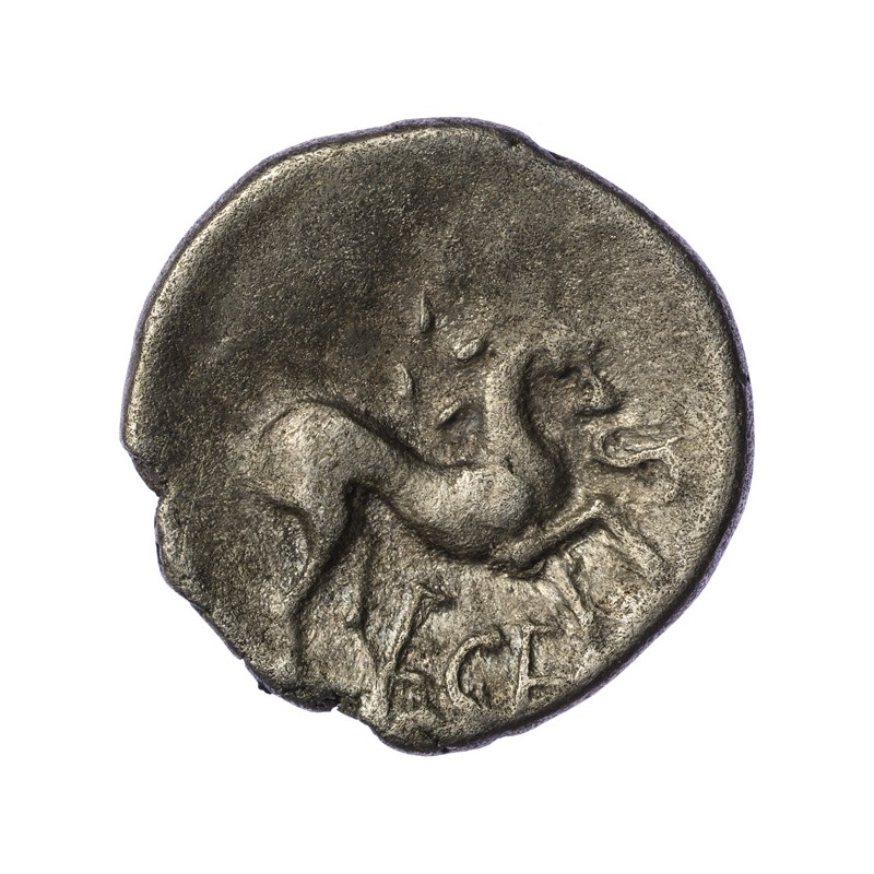 Horse r. with corn-ear mane, three leaves on shoulder, [pellet sun above], ECE below.