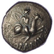 Warrior on horse facing right, carrying oval shield, COMMI F below.