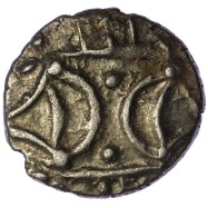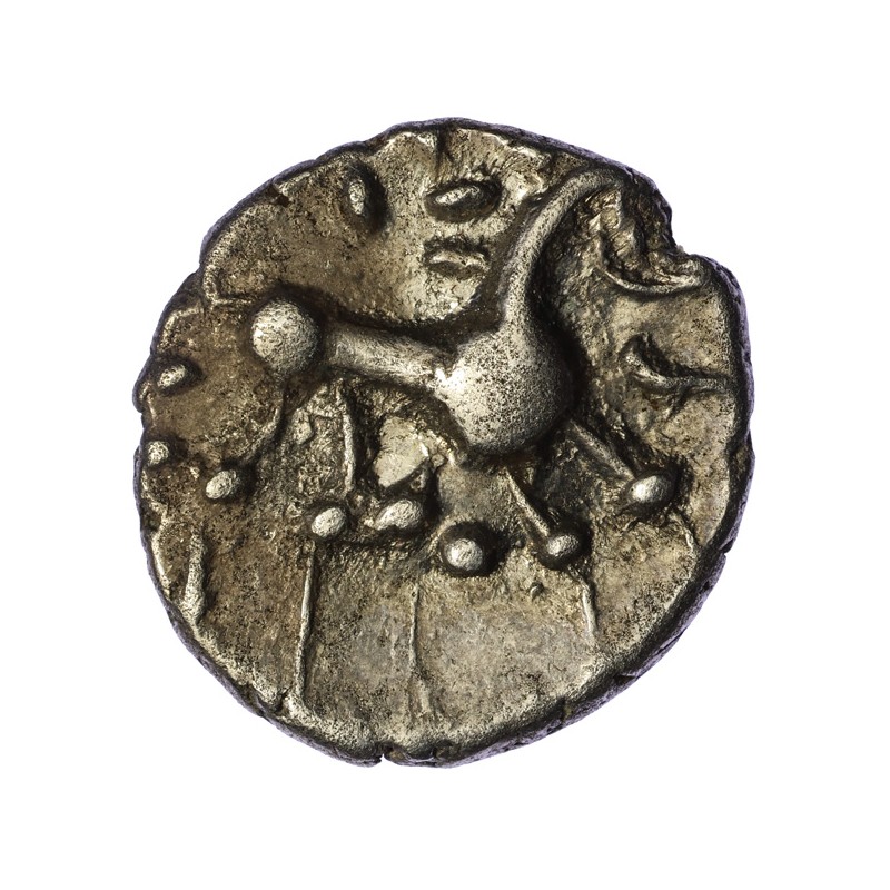 Globular horse right, large oval head with pellet for eye, S below head, wreath-like mane, two pellets below tail, pelleted sun above, two pellets and ED below.