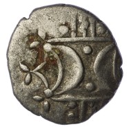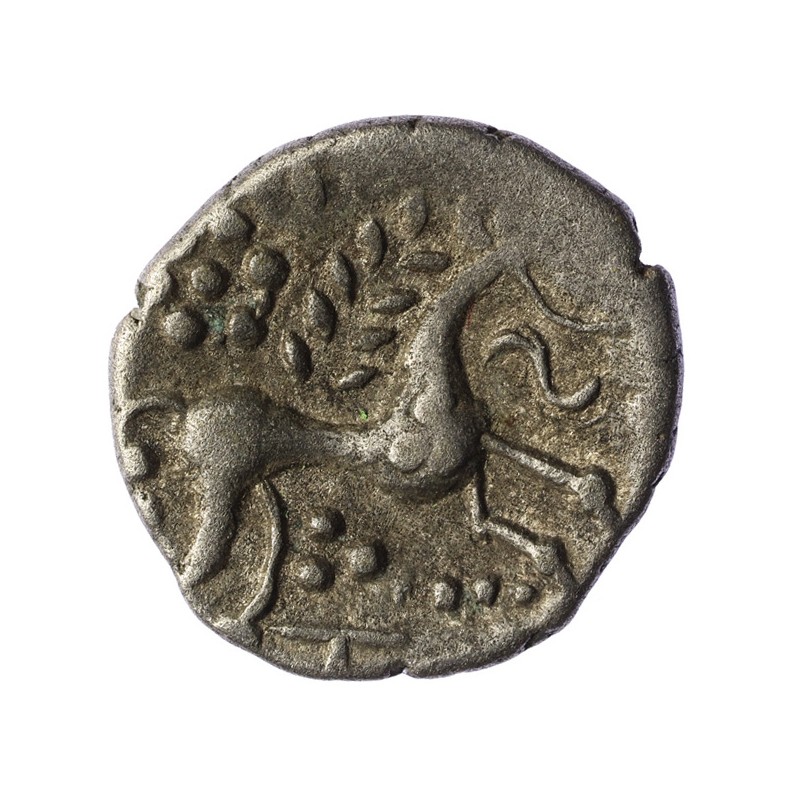 Horse right, large oval head with pellet for eye, reversed S below head, corn-ear mane, two pellets below tail, pelleted sun above. Pellet triad, horizontal pellet line and ATD monogram below.