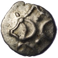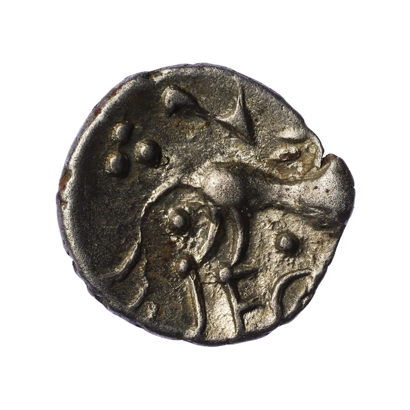 Globular horse right, solid head, rein between chest and nose, pellet triad either side of V-shaped motif above, EC[E] or EC[EN] monogram below.
