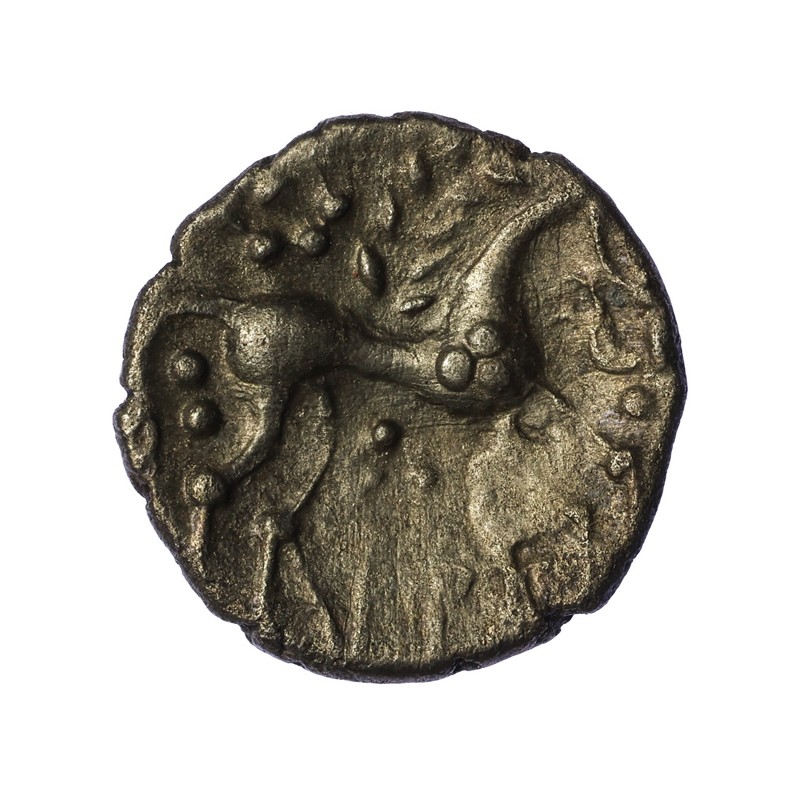 Horse right, large oval head with pellet for eye, reversed S below head, corn-ear mane, two pellets below tail, pelleted sun above. Pellet triad and ATD monogram below.