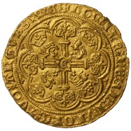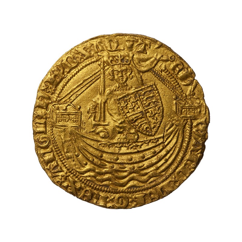 EDWARD DEI G REX ANGL D HYB Z AQT. King standing facing in a ship, sword in right hand, shield in left. Annulet before EDWARD, double satire stops