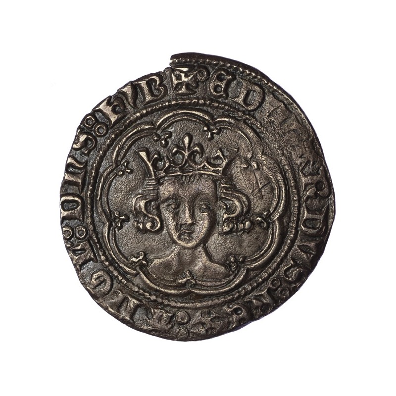 EDWARDVS REX ANGL DNS HYB. Crowned facing bust in tressure of nine arches. Annulet before EDWARDVS, double annulet stops.