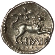 Lion bounding right, flower above, EPATI below.