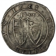 1653 GOD WITH US. Joined shields of St. George and Ireland with value mark II VI above.