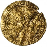 EDWARD DEI [GR]A REX ANGL Z FRANC D HYB. King standing facing in a ship, sword in right hand, shield in left. Open E’s and roman N.