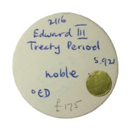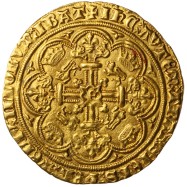 EDWARD DEI GRA REX ANGL DNS HYB Z AQT. King standing facing in a ship, sword in right hand, shield in left, annulet before Edward, double satire stops.