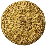 EDWARD DI GRA REX ANGL Z FRANC DNS HIB Z AQVIT. King standing facing in a ship, sword in right hand, shield in left, flag at stern.