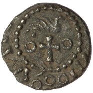 Bird on cross with annulet at end of each horizontal arm, blundered legend around.