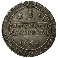EXVRGAT DEVS DISSIPENTVR INIMICI. Declaration RELIG PROT LEG ANG LIBER PAR in two lines, three plumes with pellets and V above, date 1643 below.