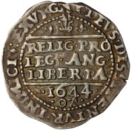 EXVRGAT DEVS DISSIPENTVR INIMICI. Declaration RELIG PRO LEG ANG LIBER PA in three lines, single plume two lis above, date 1644 and OX below.