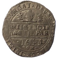 [E]XVRGAT DEVS DISSIPENTVR INIMIC[I]. Declaration RELIG PRO LE ANG LIB PAR in two lines, two plumes flanking large central plume above, large date 1644 in script with OX and pellets below.