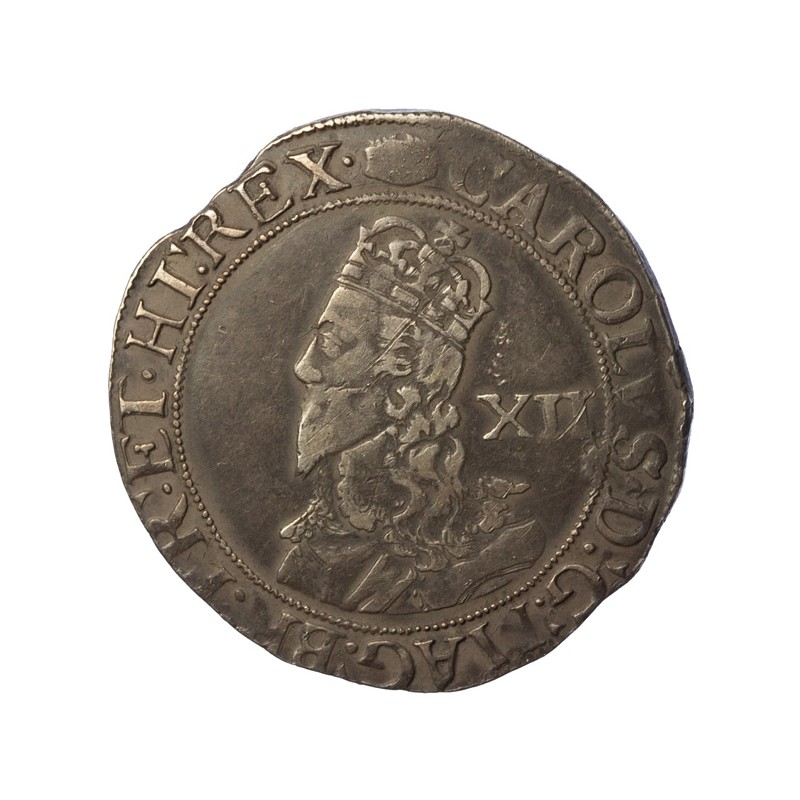 CAROLVS D G MA BR FR ET HI R[EX]. Fifth 'Aberystwyth' bust l. with double arched crown, small value mark XII behind.