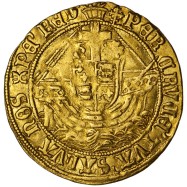 PER CRVCE TVA SALVA NOS XPE RED. Ship sailing r. quartered shield of arms at deck, h and rose at mast.