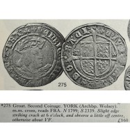 CIVI[T]AS EBORACI. Cross fourchee over royal shield, T W to sides and cardinal's hat below.