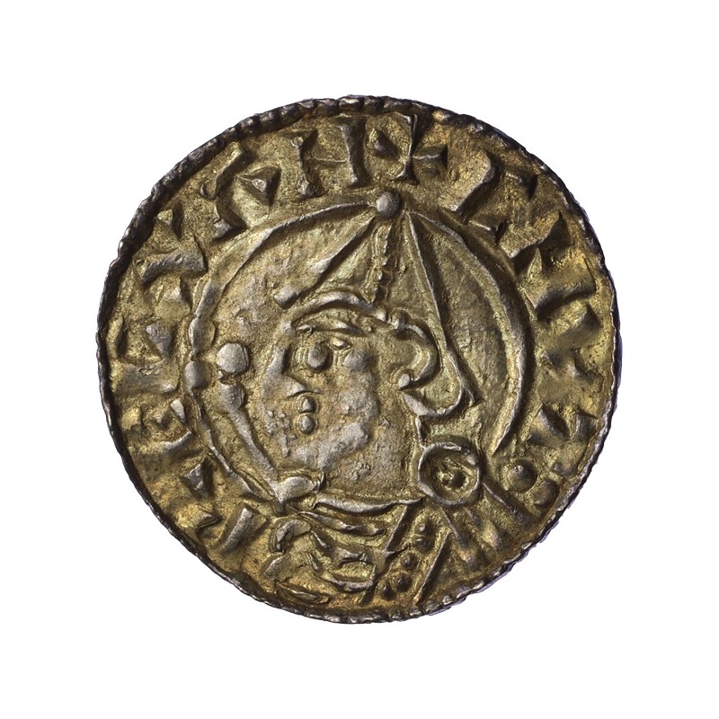 CNUT REX AN. Bust left, wearing pointed helmet with sceptre in front.