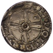 BIRD ON HEST[INPOR]. Voided short cross with expanding limbs joined by two circles. Extra pellet in quarter.