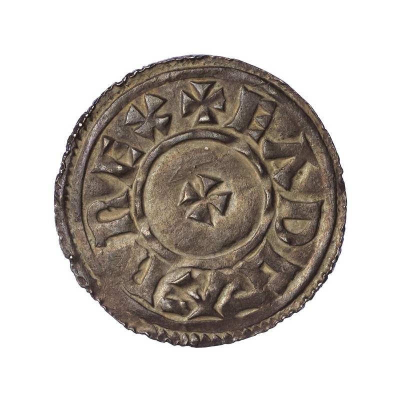 HERIG ER M̄O. Moneyer's name in two lines, divided by crosses with pellet triad above and below.