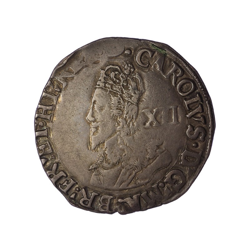 CAROLVS D G MA BR FR ET HI REX. Aberystwyth bust l. with value mark XII behind.