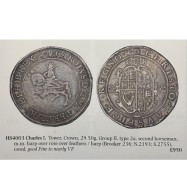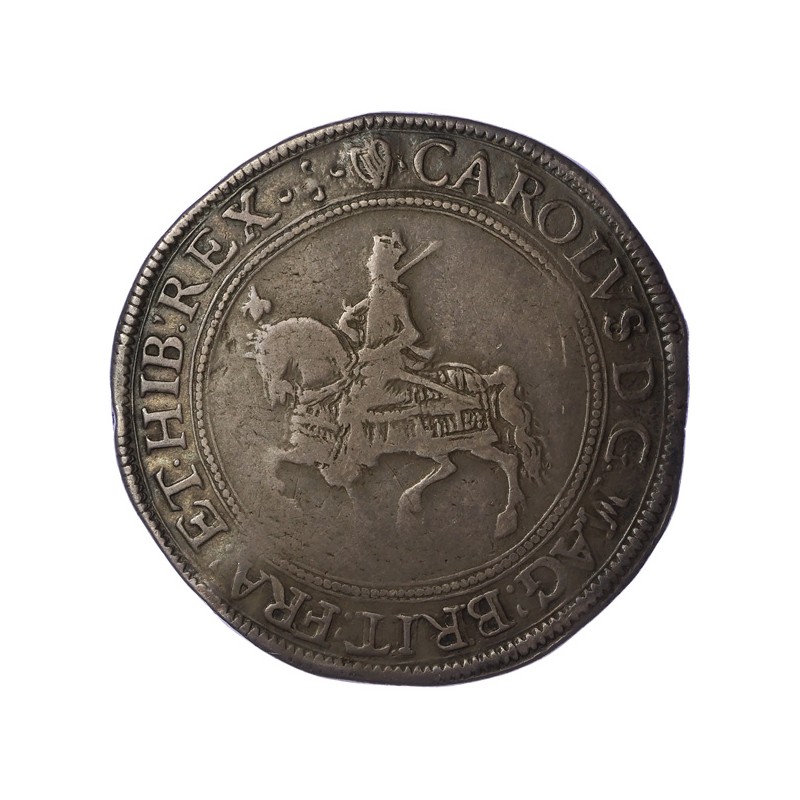 CAROLVS D G MAG BRIT FRA ET HIB REX. Second horseman, plume on head, sword on shoulder, cross on housings.