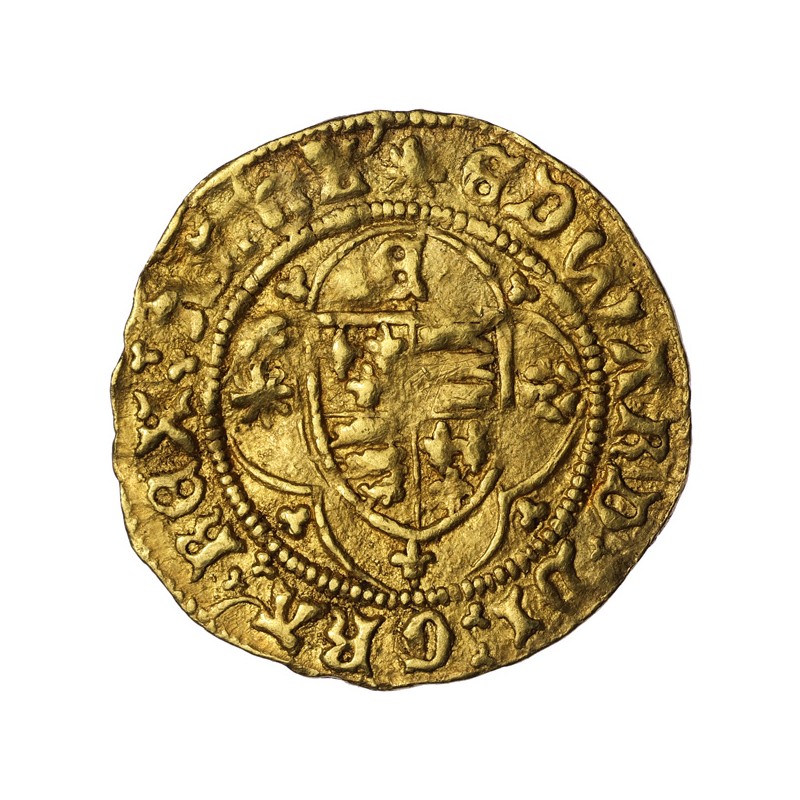 EDWARD DI GRA REX ANGL. Quartered shield of arms of England and France within tressure of four arches, sun and rose to sides, large E above and lis below.